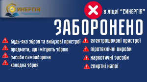 Задля створення безпечного освітнього простору в ліцеї «СИНЕРГІЯ» повідомляємо: згідно з постановою Кабінету Міністрів України від 14.01.2026 № 70 затверджено перелік предметів і речовин, з якими заборонено перебувати на території та в приміщеннях закладів загальної середньої освіти.