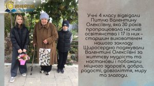 День людей похилого віку часто відзначають напередодні Дня вчителя. І, зрозуміло, учні нашої школи не забувають педагогів – ветеранів, які довгі роки свої знання, уміння передавали підростаючому поколінню. Так, нушенята 1, 2, 3, 4, 5 та 6 класів висловили подяку вчителям та вихователям Глотовій Л.О., Якубенко В.Т., Горовенко В.Г., Горовенку В.К., Логвиненко В.Ф., Подколзіній В.І., бібліотекарю Чаплі Н.С.; здобувачі освіти 8, 9, 10, 11 класів вручили подарунки і сказали слова вдячності вихователям Фартушко Л.В., Булатовій Н.О., Поддубній З.М., Питлі В.О.